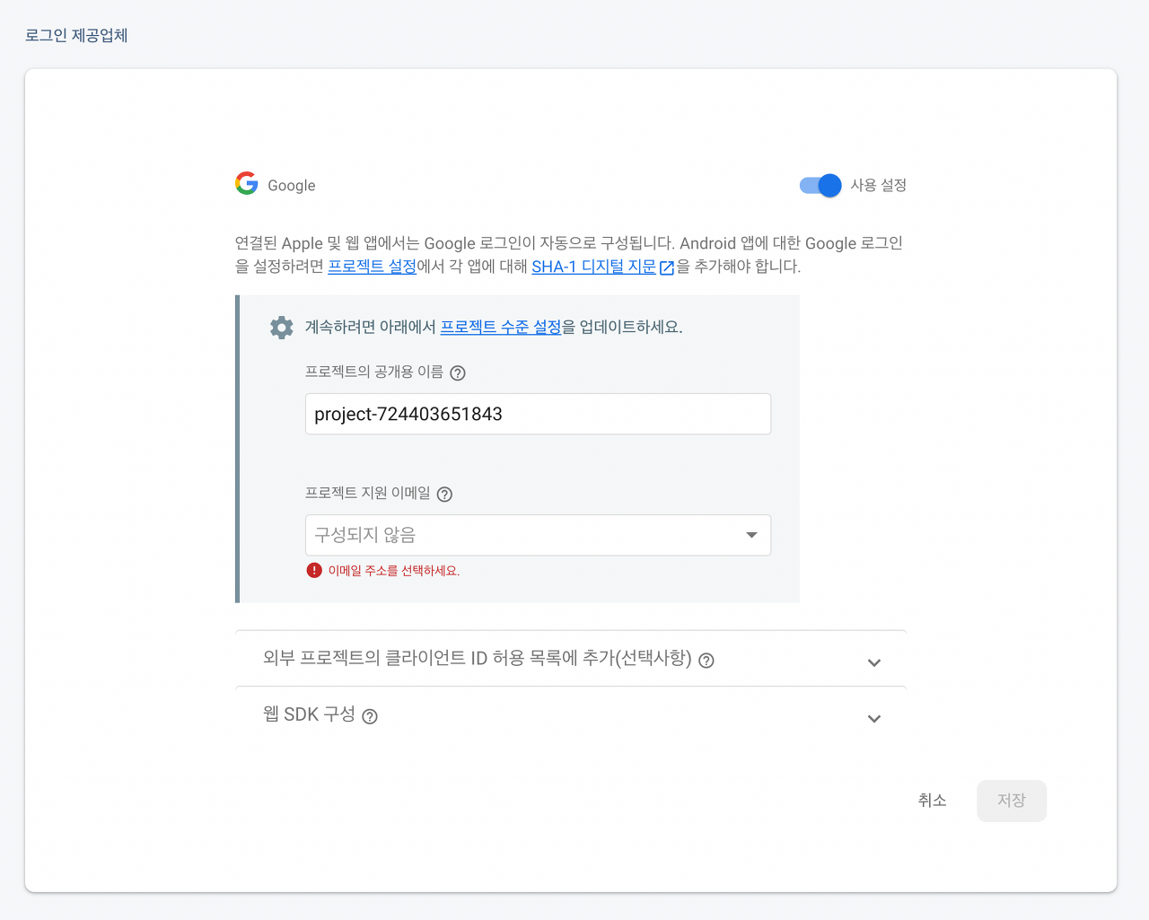 그 후 구글 로그인을 활성화해주고, 안내에 따라 설정해주면 됩니다.